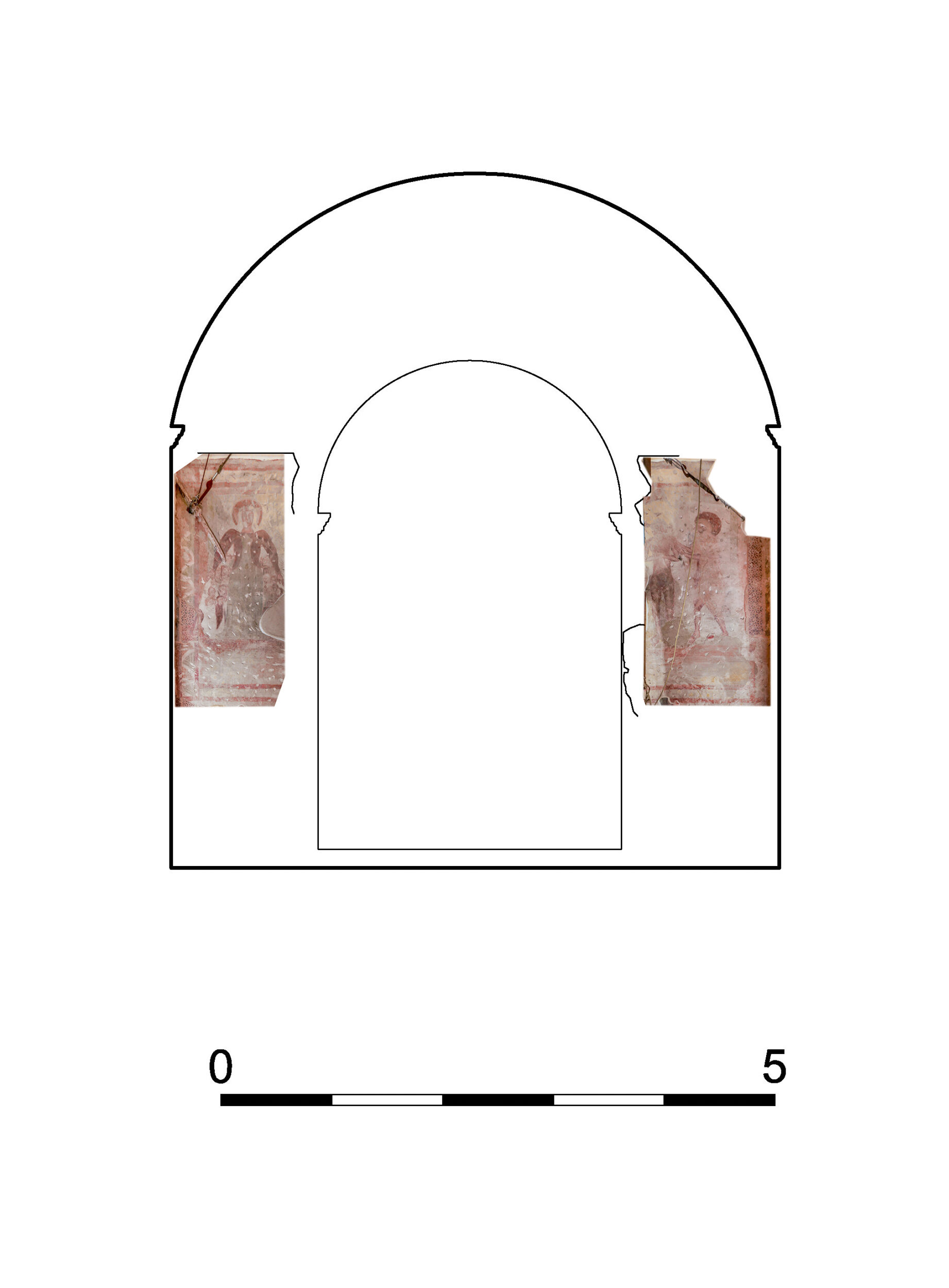 The halos are neither incised nor decorated with pouncings. The only incisions that can be detected are very thin and barely visible horizontal (perhaps also vertical) bordure lines, for which a ruler must have been used (Fig. 4). The underdrawing was applied in a light red colour, which can still be clearly seen, especially in the modelling of the faces of the figures under Mary’s mantle. In some spots, the darker final contour painted over it is still visible (Fig. 5). There are no underpaintings: the broad uniform colour surfaces are in fact the basic colour tones of the floor, the background, and the draperies, on which the painter subsequently applied the modelling. The facial features of the main figures are mostly blurred. The manner in which the painter modelled the faces is best seen in the secondary figures of people huddling under Mary’s mantle in intercession. They indicate a less skilled folk painter who conceived of elongated but slightly rounded faces with broad round chins (Fig. 5). The eyes are relatively small and narrow, and in some places, only a slightly lighter red shading of the upper eyelid can still be discerned. The eyebrows are set high, slightly semicircular and drawn with the same broad line as the eyes. The nose, which continues from the inner eyebrow, has a rounded tip and is somewhat “potato-shaped”, featuring wide, casually shaped nostrils, further defined by an inner line. The mouth has mostly been preserved only as a central line, rounded upwards with accentuated corners, creating a slight smile. Characteristically of this painter, the figures on Mary’s right side feature three lines, starting from a point under the chin and diverging towards the neck. The hands are extraordinarily narrow and long, featuring thin parallel fingers, so they look rather unnatural. The supporting figures may be the work of an assistant, as Mary’s face, painted frontally, looks somewhat more elegant despite its poor preservation: it is more elongated, with a low forehead and a long nose that opens into wide nostrils (resembling a three-feathered clover), while the eyebrows are thin and set high above the narrow and elongated eyes. The preserved red colour indicates fleshy lips. Remnants of colour modelling with darker layers can be discerned around the eyes, along both sides of the nose, around the chin, and along the outer line of the face, while especially the forehead, the nasal ridge, and the cheekbones are brighter and thus stand out. On Mary’s hands, it is still possible to see the basic ochre layer with darker reddish modelling, applied in broad strokes along all the fingers and the upper part of the palm at the sleeve (Fig. 5). Colour modelling has also been partly preserved in the Baptism of Christ scene on the southern side of the triumphal arch. For both Jesus and St John the Baptist, the painter used the same pinkish-ochre basic tone as for Mary’s carnation. However, the shading appears darker in places (especially on John’s left cheek), which is otherwise characteristic of male carnations. The painter used a broad brush to apply shading along the outer edges of the torso, arms, and legs, leaving the central parts brighter. In this manner, he designed a three-dimensional body, though somewhat clumsily. However, despite the modelling, Christ’s body in particular comes across as schematic due to the awkwardly shaped ribs, drawn only as parallel horizontal lines almost reaching the waist; the painter was obviously not well-versed in anatomy. In both scenes, the figures are concluded with a strong and broad reddish-brown contour. The modelling of the draperies has only been preserved in the case of Mary, who wears a red-green dress and a red mantle with white lining over her shoulders. Her slim and long figure is presented en face, and she has broad round shoulders, so she appears disproportionate and stocky despite her slimness. The red and green colours were applied with a broad brush, while the additional modelling of the skirt’s folds can now barely be seen, as only the remnants of broad dark-green vertical strokes are still visible (Fig. 5). They were obviously applied to the plaster when it was already dry. The painter used broad brushes, and no fine modelling can be found.