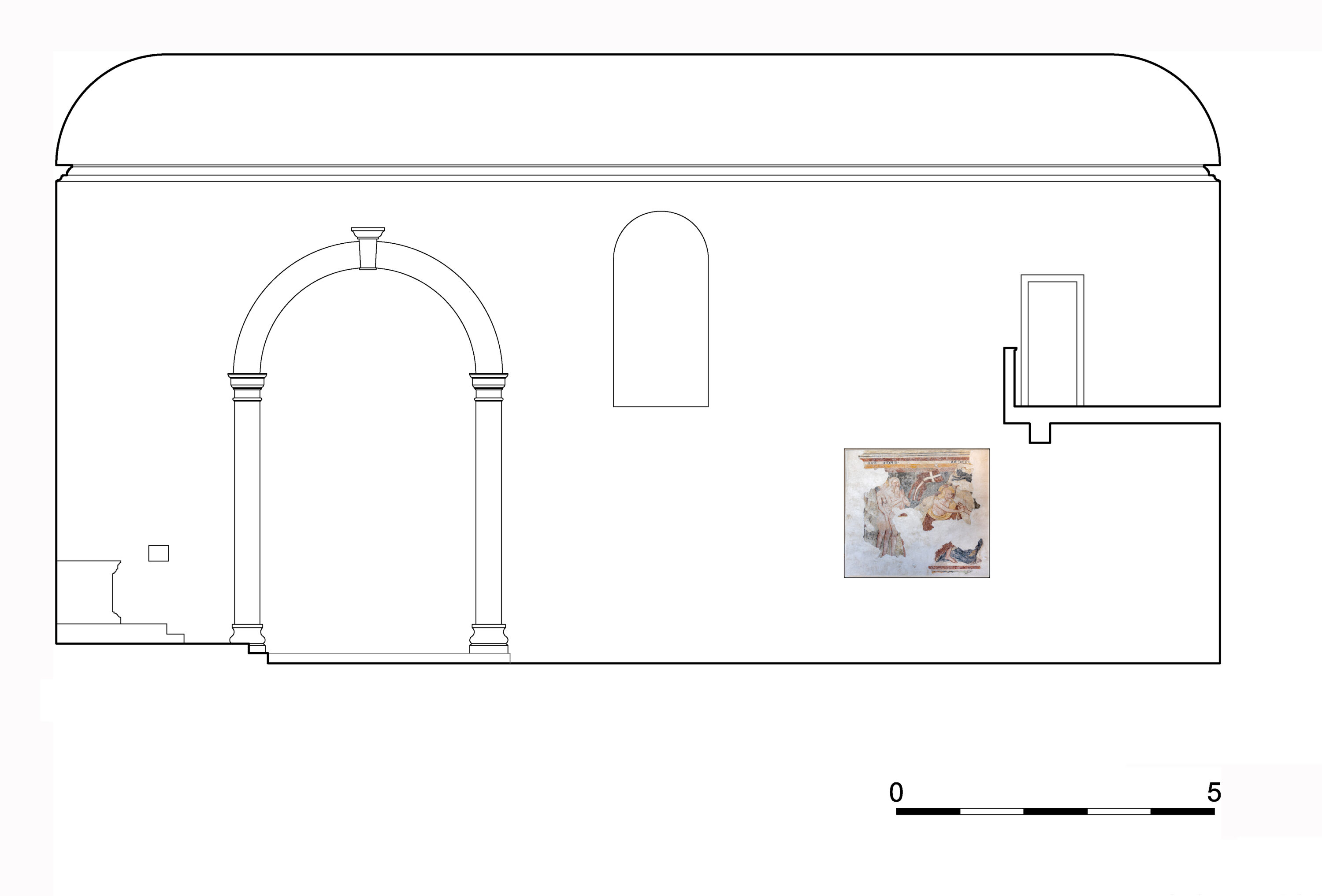 The well-preserved colours indicate that the mural was painted in the fresco buono technique, as is also confirmed by the cross-sections of the samples and the composition of the plaster. The pigments were impregnated with lime water and applied to the still-fresh plaster. The final details were probably finished dry, though it seems that only a small part of the painting was completed al secco, as even the final contour is still very well preserved. Certain secondary parts, such as the floor, for example, were apparently painted on limewash (fig. 7), as the plaster had dried by the time of the painting, indicating the application of larger giornate.