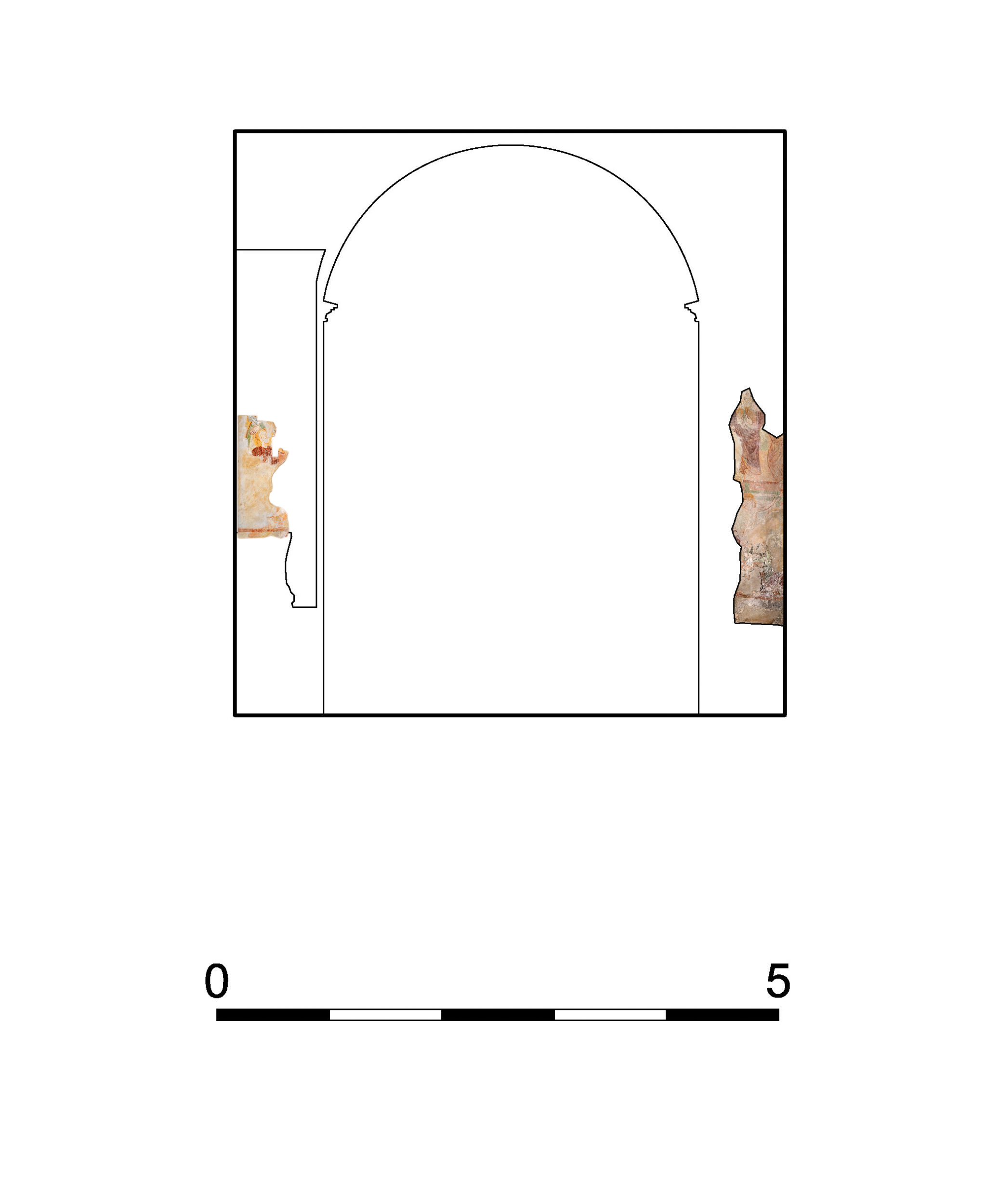 Gre za slikanje al fresco, torej na svež omet. Meja med barvno plastjo in ometom kaže na prehajanje apna navzgor.